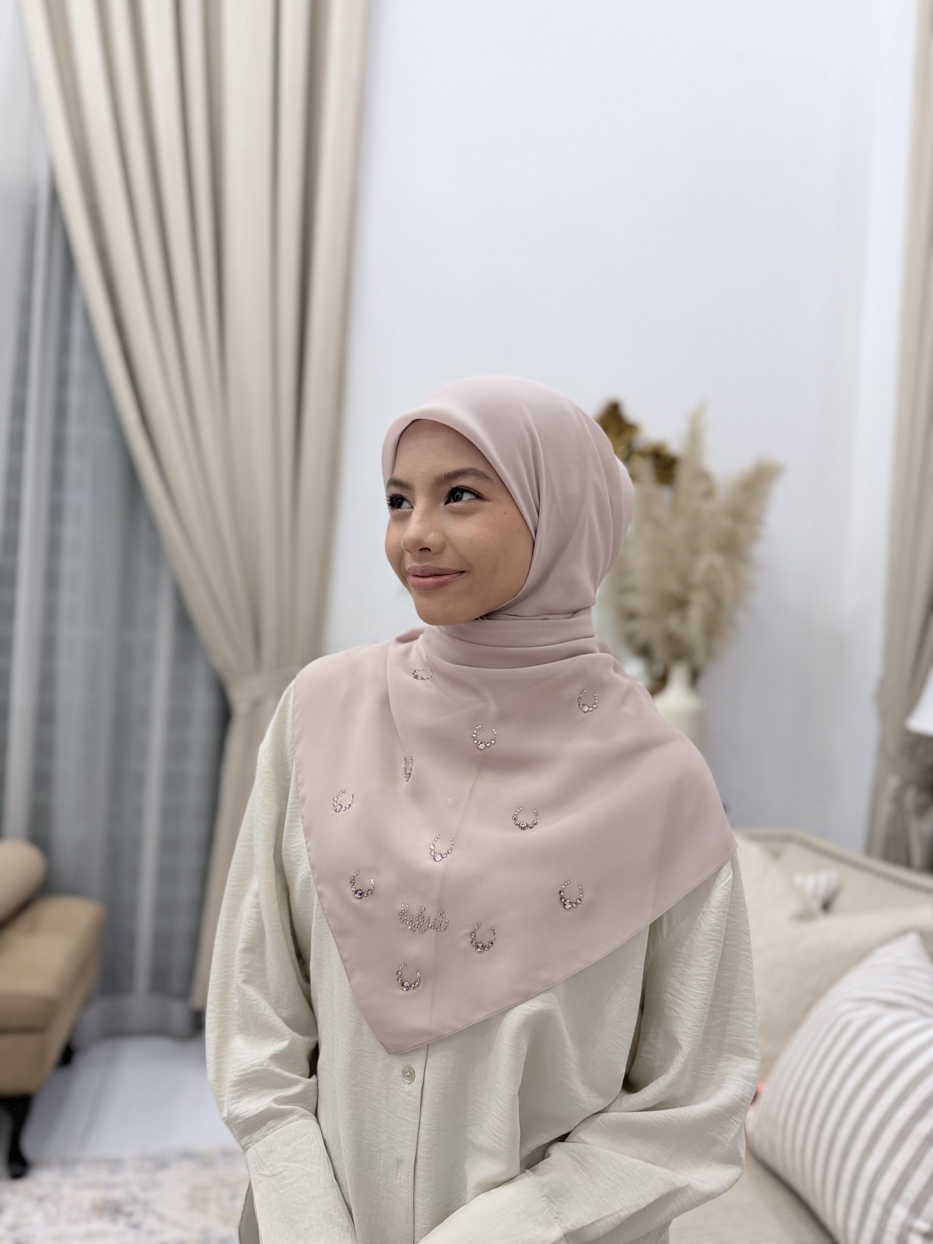 Sharqiaa Hijab brand is an imported hijab from Saudi Arabia. Sharqiaa offers a range of hijabs adorned with authentic Swarovski crystals, combining traditional modest wear with a touch of luxury. These hijabs are crafted from premium fabrics such as Amwaj chiffon, known for its softness and elegance. The Swarovski crystals are meticulously applied, enhancing the hijabs’ aesthetic appeal with a subtle sparkle.